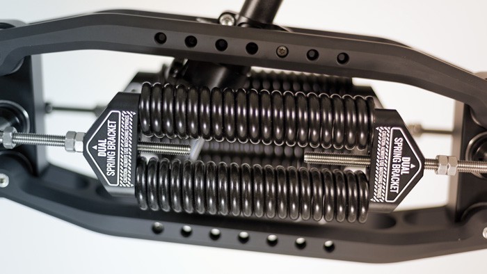 La version Black Complete est destinée aux utilisateurs travaillant avec des charges plus importantes allant jusqu'à 5-32 kg. Il est livré avec quatre ressorts de 7,0 mm et quatre ressorts de 7,5 mm qui couvrent toute la plage de poids de 5 à 32 kg. Vous pouvez utiliser des ressorts en configuration simple (un ressort de chaque côté) ou double (deux ressorts de chaque côté) pour atteindre précisément l'effet souhaité. L'amortissement est réglé à l'aide d'un bouton qui a 22 niveaux pour régler précisément la valeur d'amortissement requise. Le Black Complete est livré avec six amortisseurs, ce qui permet l'utilisation d'amortisseurs doubles.